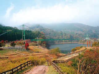 塩原ダムに架かる本州最長(全長320m)の無補剛桁歩道吊橋。きらきらと光る湖面の上を、新緑や紅葉、雪景色を眺めながら空中散歩を楽しむことができます。