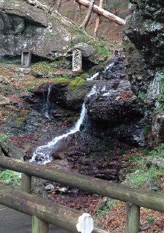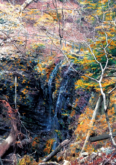 回顧橋の手前の古道を右に入ると、ほんの40〜50m先に思いがけない爽やかな滝がある。清らかで涼しげな滝の辺に不動を現したものと思われる梵字の石碑が建ち、かつては、その横に不動明王の像が奉られていた。